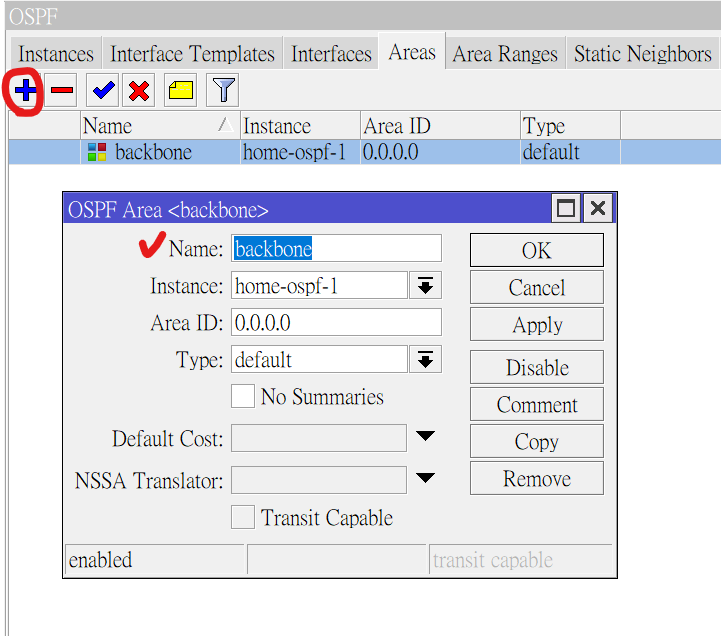 再來進入到Area頁籤內並點選視窗左上角的+號進行新增OSPF Area。因為是小型網路,這邊主要都會將路由器分配到Backbone Area內,也就是0.0.0.0這個ID的Area,分Area主要是防止動盪,以免路由更新時影響到整個網路。這邊只需要輸入自訂區域名稱並選取對應的OSPF Instance,其他選項保持預設即可,預設應該就是使用0.0.0.0這個Area ID。三個路由器都各自重複此步驟進行設定。