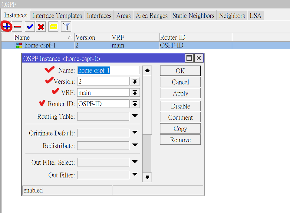 一開始進入到Instances頁籤內並點選視窗左上角的+號進行新增OSPF Instance。輸入自訂的名稱並選取稍早前創建的Router ID完成設定,版本使用2版,VRF選擇main則保持預設。三個路由器都各自重複此步驟進行設定。