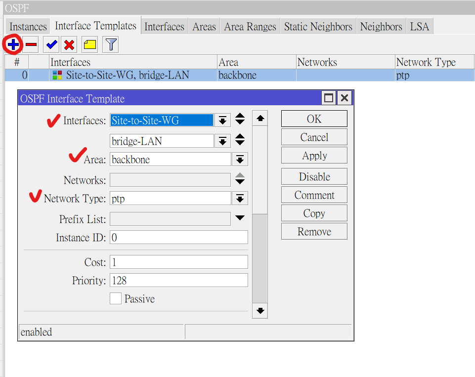 最後進入到Interface Templates頁籤內並點選視窗左上角的+號進行新增Interface Template。這邊主要是讓管理員選擇想要參與OSPF交換網段路由的介面,被選中的介面上存在的網段就會動態的透過OSPF進行交換。這邊需要選擇想要交換的介面、路由所屬的OSPF Area ID以及Network Type。這邊要特別注意,Network Type使用broadcast或ptp都可以,唯所有路由器上的此設定皆需一致,也就是要不所有的路由器都使用broadcast這個Network Type,要不就所有路由器都使用ptp。三個路由器都各自重複此步驟進行設定。