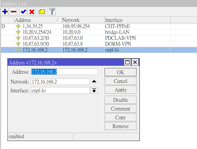 再來要為這個Bridge介面設定IP,先選取RouterOS內IP->Address選項,並點選視窗左上角的+號進行新增。選取相對應的Bridge介面,並給予Router ID所表示的IP位置。三個路由器都各自重複此步驟進行設定。