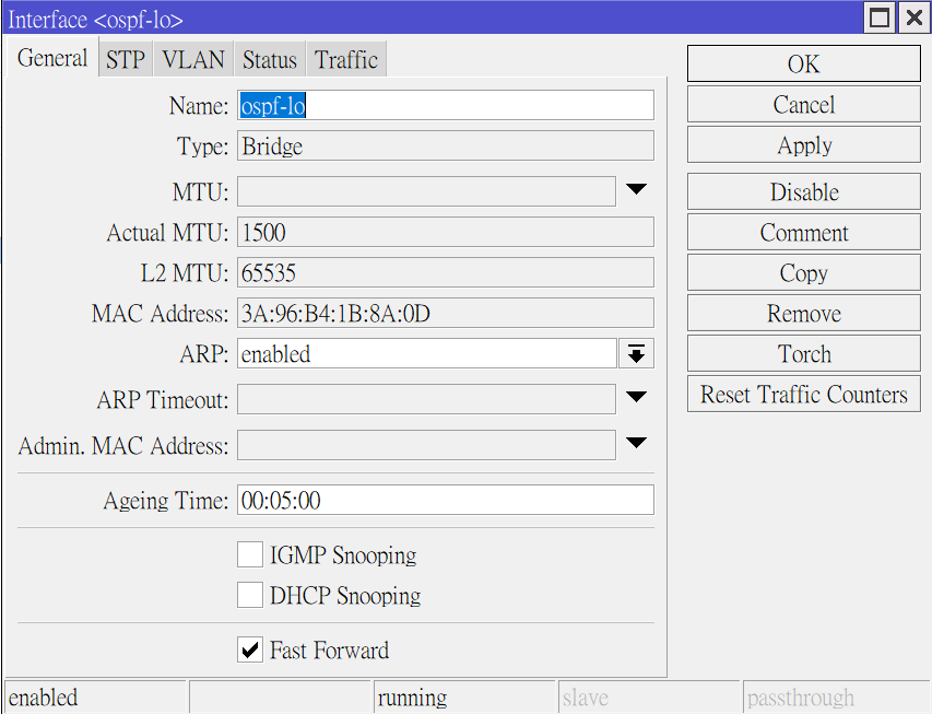 這邊要設定Bridge介面,先選取RouterOS內Interface選項,並點選視窗左上角的+號進行新增。只需填入名子即可,其他保持預設。