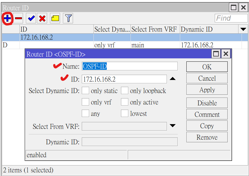 要設定Router ID,先選取RouterOS內Routing->Router ID選項,並點選視窗左上角的+號進行新增。並填入自訂名稱以及Router ID兩個資訊。三個路由器都各自重複此步驟進行設定,此次分享的Router ID名稱設定都位於上方架構圖中。