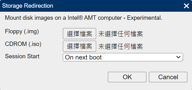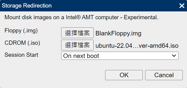 但坑就在這裡,不知道是 MeshCommander 設計的關係還是 Intel AMT,若該選項沒有插入任何東西,該功能一樣會重導向該映像選項,造成 Ubuntu 行為異常。